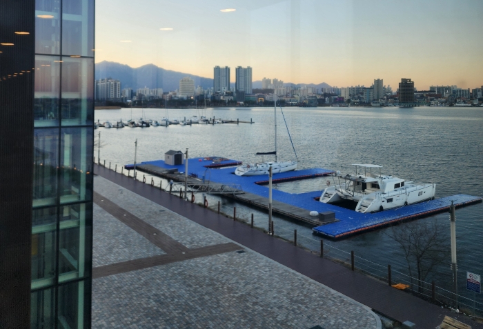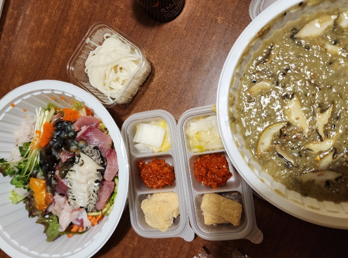 저녁은 차를 타고 청초수물회 본점에 갔다. 아이가 차에서 잠이 들어서 해전물회와 전복죽을 포장했는데 식당 뷰가 정말 아름다워서 조금 아쉬웠다.