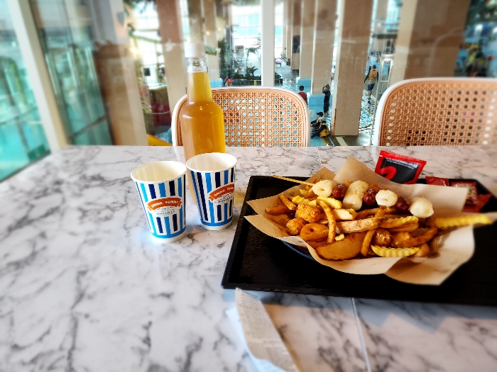 점심은 1층에 있는 치킨 집에서 돈가스랑 감자튀김을 먹었다. 점심 먹을 땐 추울 수 있으니 비치가운을 챙겼다.