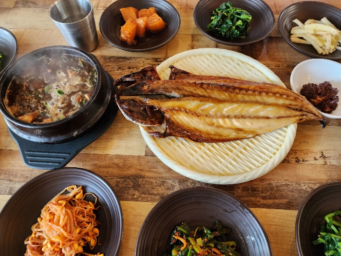 정갈한 나물 반찬과 강된장찌개, 생선구이가 나왔는데요.